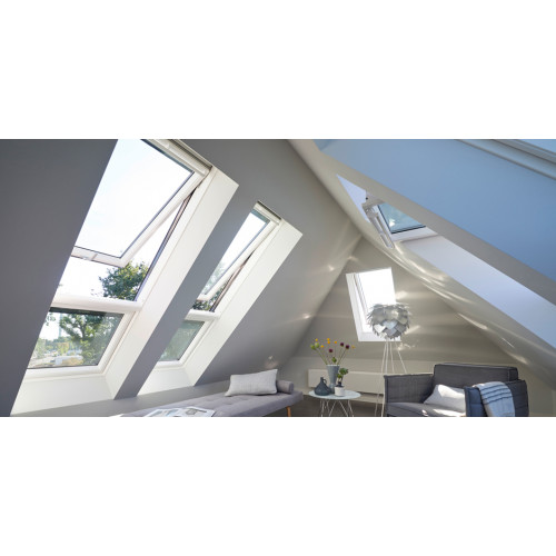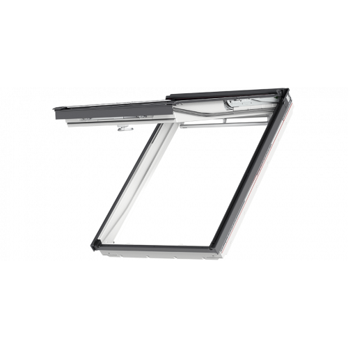 Handbediend VELUX uitzettuimelvenster, gemaakt van wit afgelakt, thermisch gemodificeerd hout met polyurethaan afwerklaag. Het dakraam is onderhoudsarm en hierdoor bij uitstek geschikt voor vochtige ruimtes, zoals keukens en badkamers. Het dakraam wordt geopend met een ergonomisch gevormde bedieningsgreep aan de onderzijde van het dakraam en scharniert primair aan de bovenzijde. Het dakraam opent naar buiten toe. Het is dus belangrijk dat er geen meubels onder het dakraam gepositioneerd worden, daar u anders het dakraam niet kunt openen of sluiten.